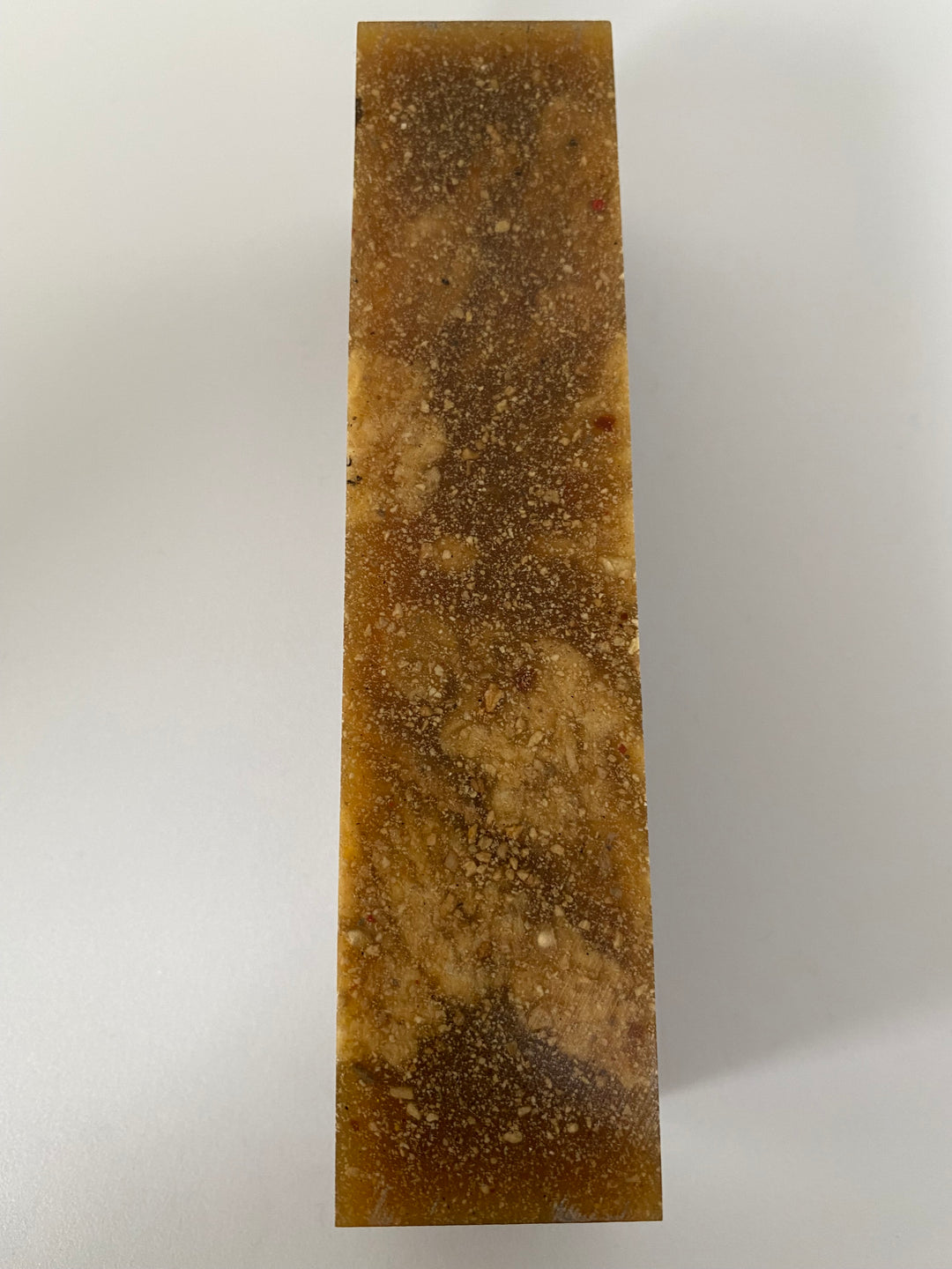 Recomposited Amber is much easier to drill, cut, sand and polish (compared to regular Amber). The process of recomposition makes amber more stable and durable, easy to work, less brittle, less vulnerable to acids and humidity. Hence this process resembles the stabilization process. This material can be easily polished to a nice shine.