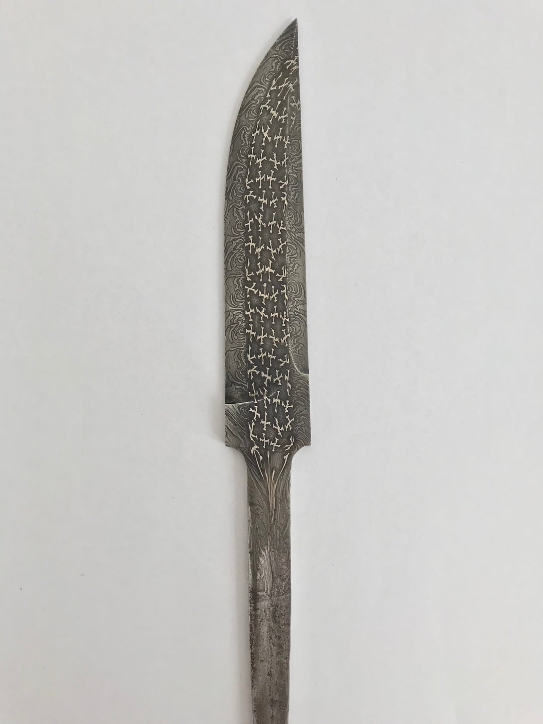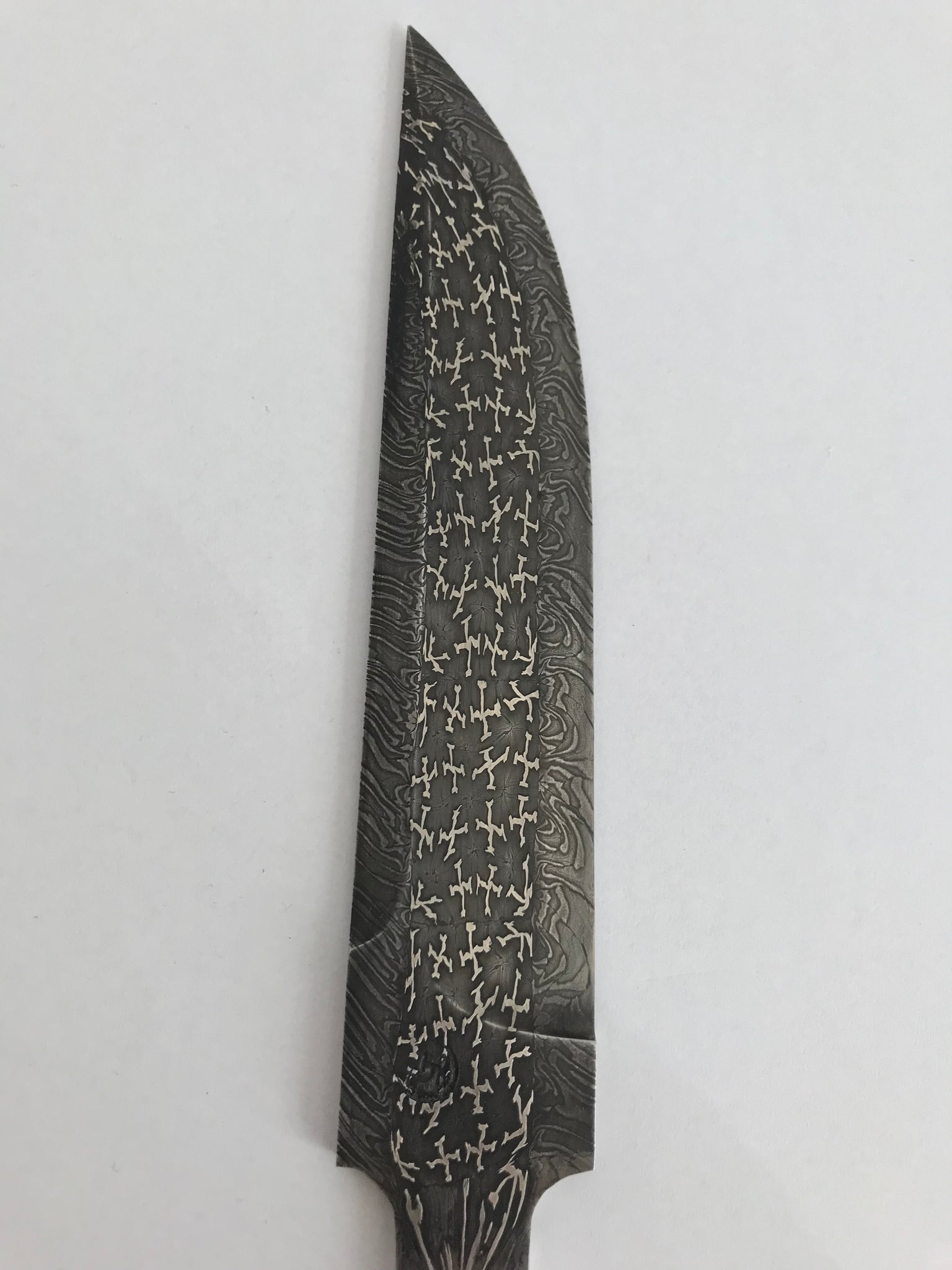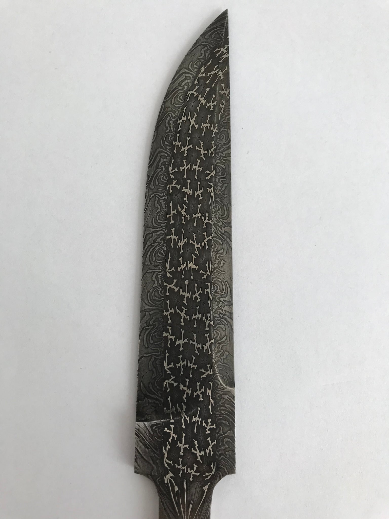- Stahl: Mosaik-Damast, Schneide (Torsion): 1 % Kohlenstoffstahl + 15N20.