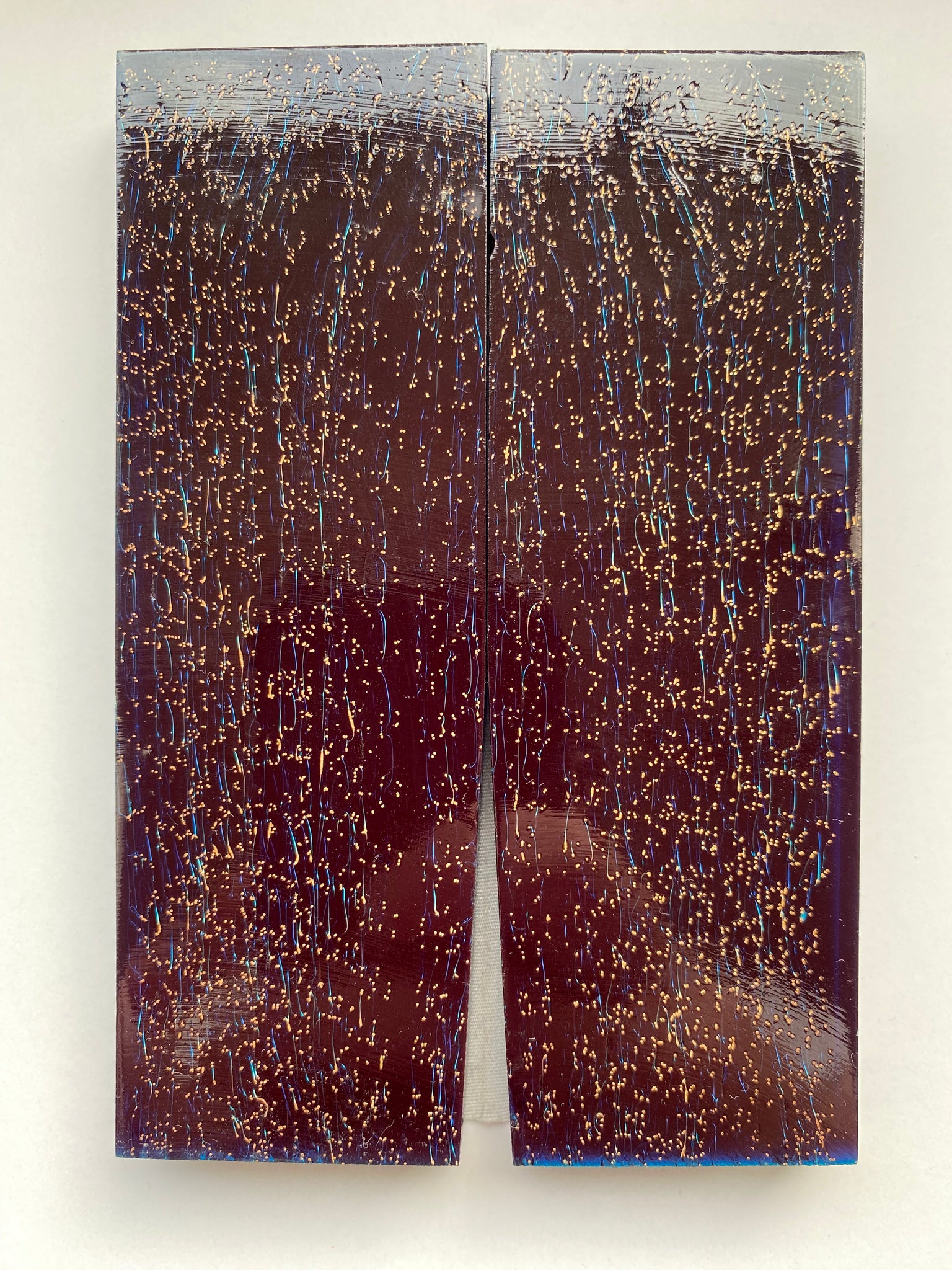 We have casted this material into a new and easily accessible handle material. Easy to cut, drill, sand and polish. Usually it gives a unique pattern of dots and lines. Can polish to a super shiny finish.