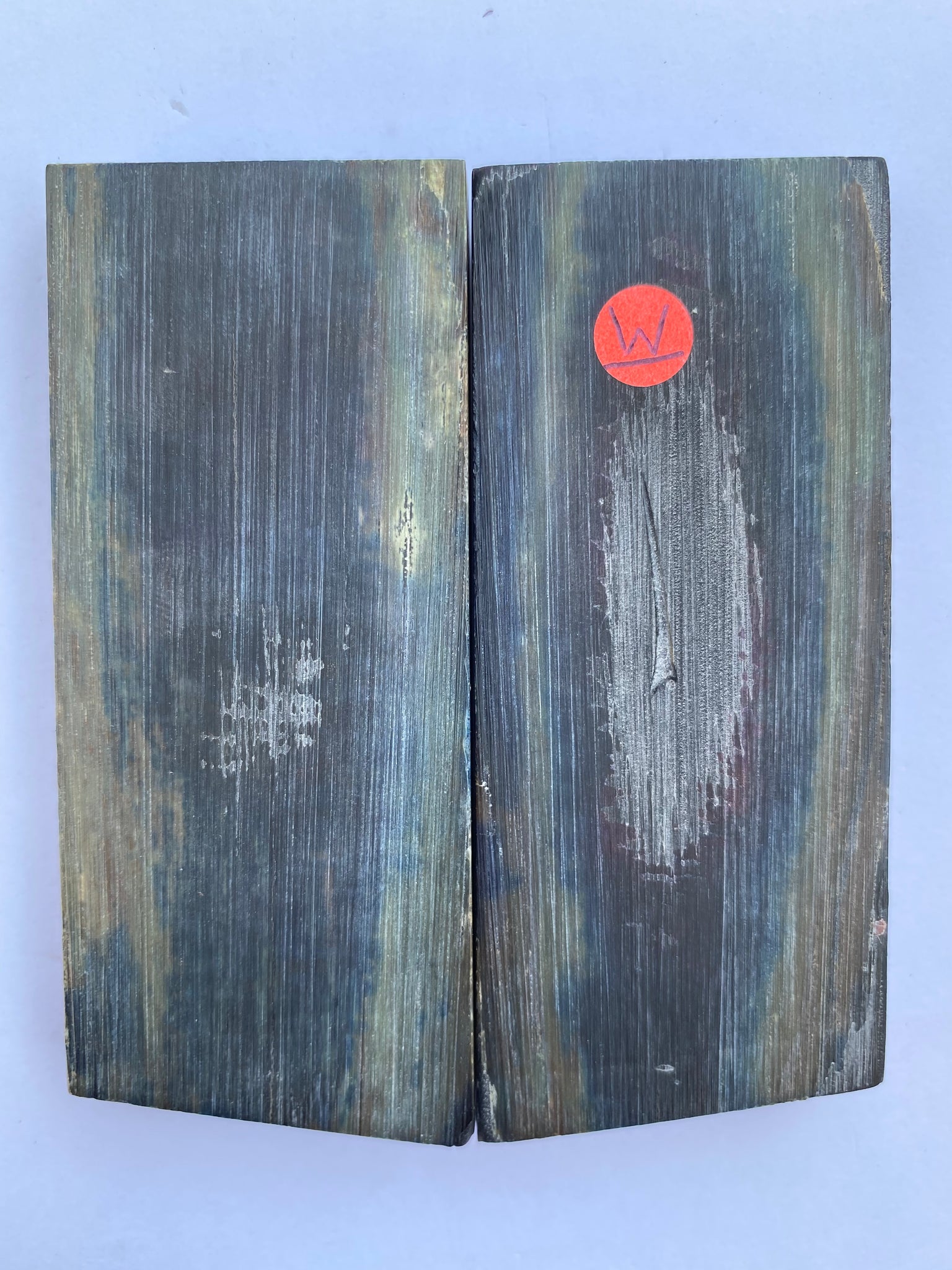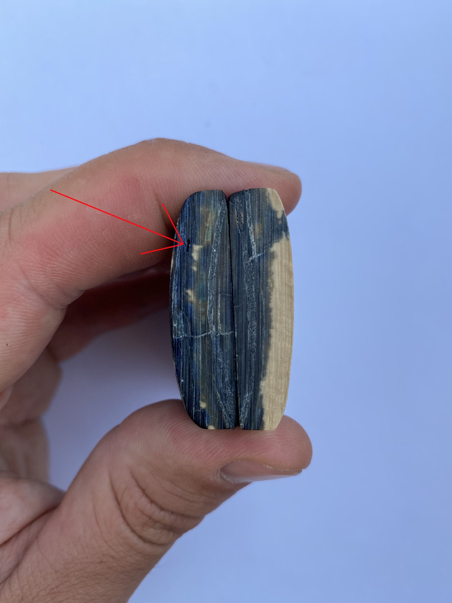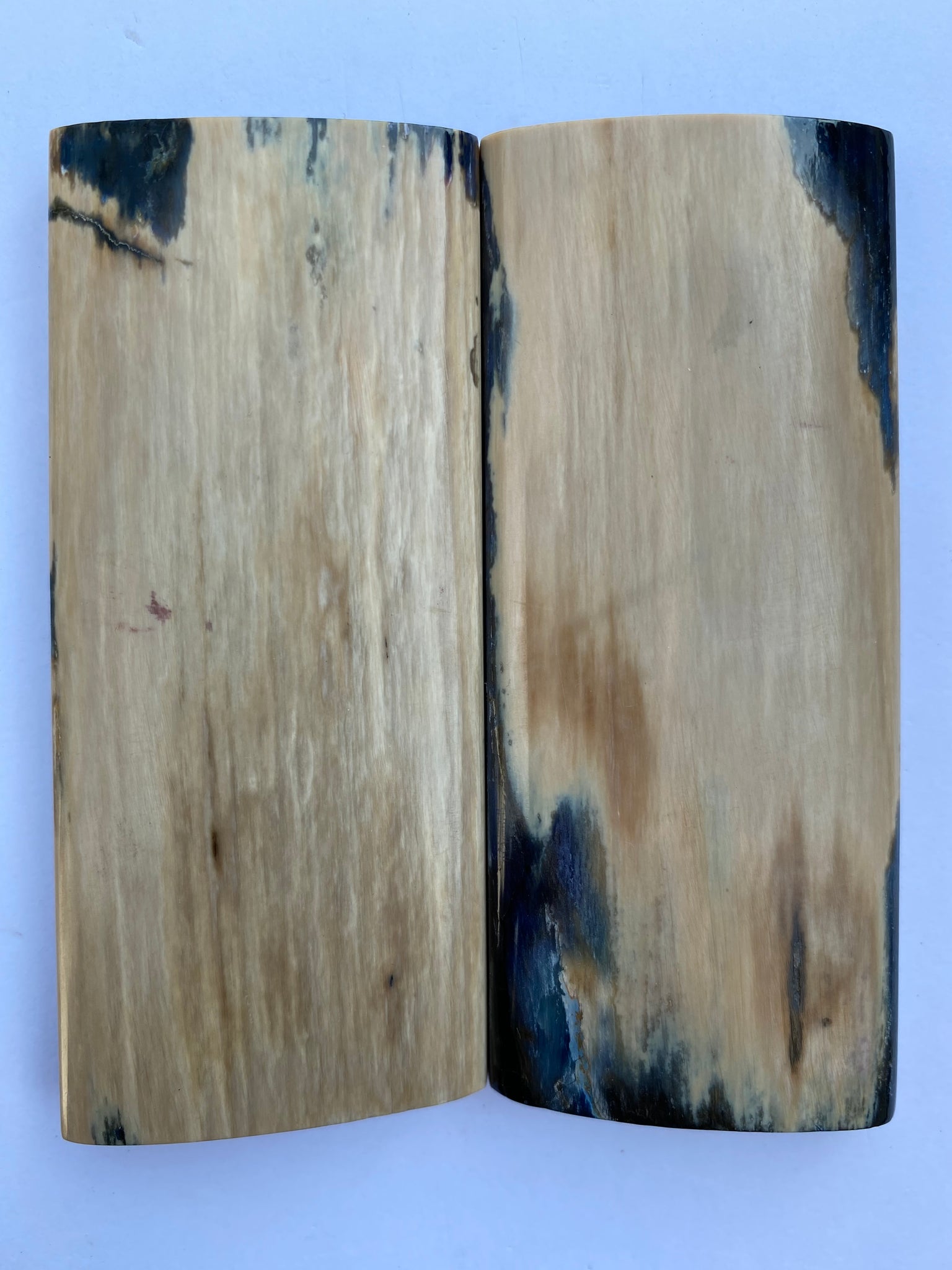 The pieces that origin from very hollow rawmaterial, have typically had their backside cavity filled with black epoxy glue. - Some of this may therefore be visible when the scale is viewed from the end. - Normally, this is not a problem for the knife maker since he will typically either hide the ends behind bolsters, or sand away the glue before utilizing the piece.