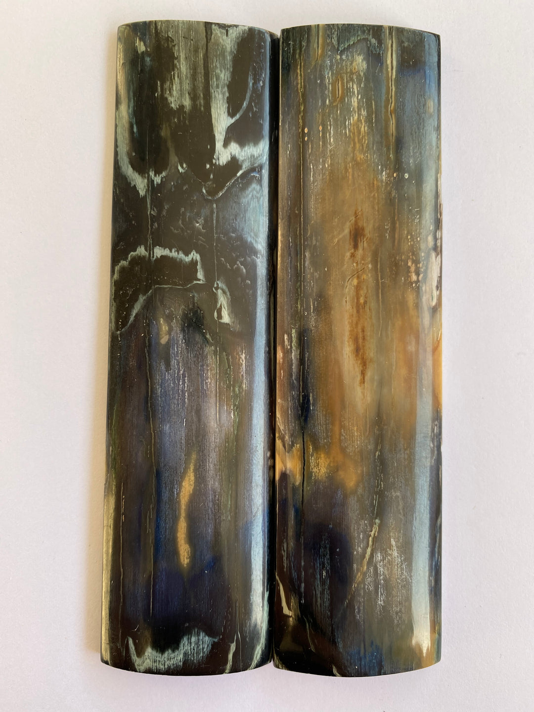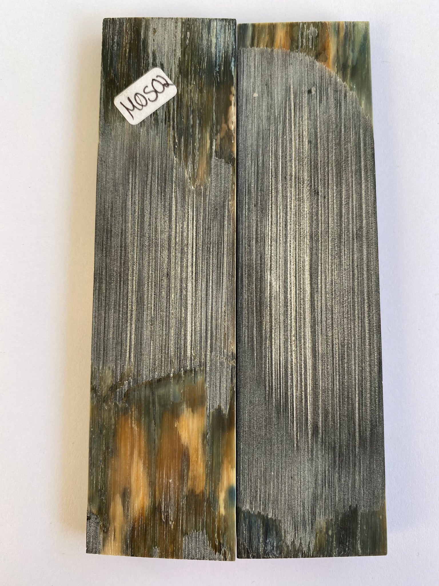 The pieces that origin from very hollow rawmaterial, have typically had their backside cavity filled with black epoxy glue. - Some of this may therefore be visible when the scale is viewed from the end. - Normally, this is not a problem for the knife maker since he will typically either hide the ends behind bolsters, or sand away the glue before utilizing the piece