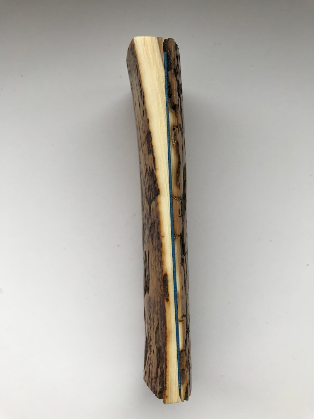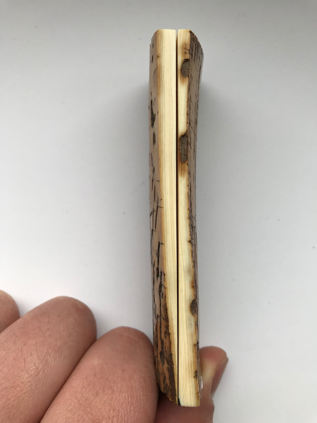 The pieces that origin from very hollow rawmaterial, have typically had their backside cavity filled with black epoxy glue. - Some of this may therefore be visible when the scale is viewed from the end. - Normally, this is not a problem for the knife maker since he will typically either hide the ends behind bolsters, or sand away the glue before utilizing the piece.